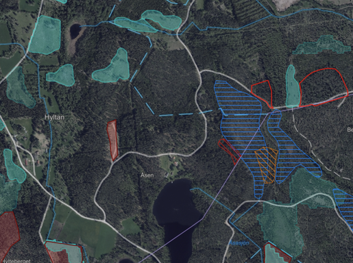 Kartan/tjänsten kan återge information om respektive objekt i text och numerärer. Kartan baseras på data/modeller från Skogsstyrelsen.